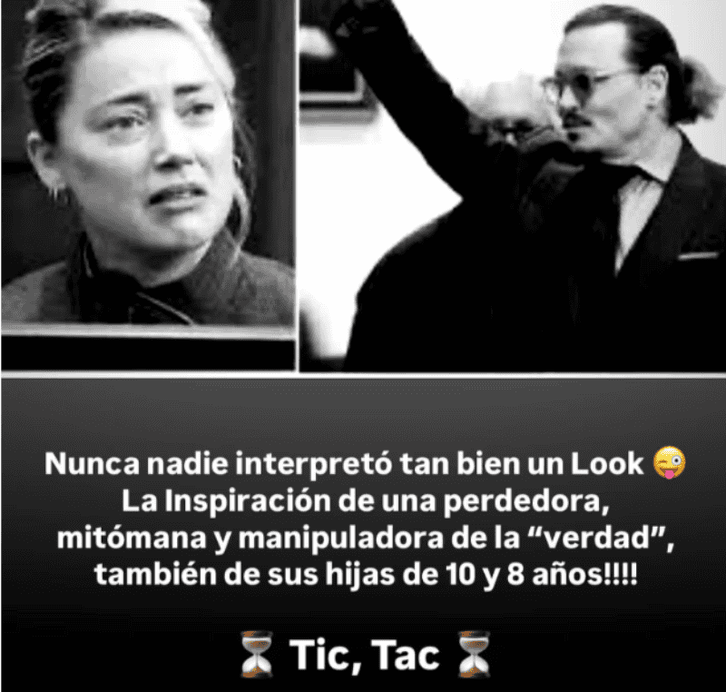 En la imagen compartida se puede ver un montaje en blanco y negro: por un lado, Amber Heard llorando en el juicio; por otro, Johnny Depp alzando el puño en señal de victoria.