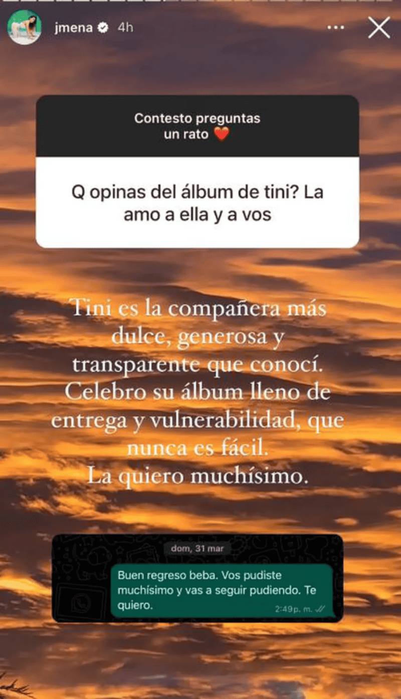 Un mechón de pelo sigue dando que hablar. Tini Stoessel lanzó su nuevo álbum y entre los colegas que la felicitaron, se destacó el mensaje de Jimena Barón, que la definió com "la más dulce y generosa".