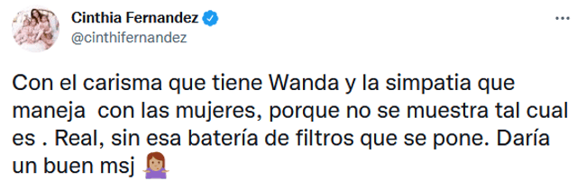 "Con el carisma que tiene Wanda y la simpatía que maneja con las mujeres, porque no se muestra tal cuál es. Real, sin esa batería de filtros que se pone. Daría un buen mensaje", escribió la panelista de Momento D (El Trece) en sus redes sociales.