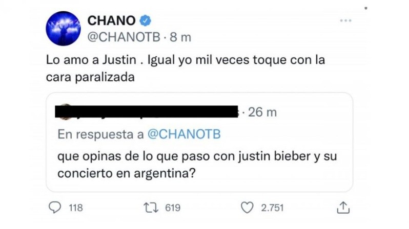 Chano Moreno Charpentier se convirtió en tendencia en Twitter tras compartir un polémico mensaje luego de interactuar con algunos fans desde su cuenta. Un usuario en Twitter le preguntó a Chano qué opinaba sobre Justin Bieber y la cancelación de sus conciertos en Argentina y su respuesta dio que hablar.