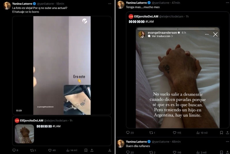 Luego de que Yanina Latorre mencionara una supuesta infidelidad de Martín Demichelis y confirmara la separación de la pareja con Evangelina Anderson, esta última compartió una historia en Instagran para negar tal versión. Sin embargo, la panelista de LAM (América) redobló la apuesta en la red social X con dos tuits, aunque, casi de inmediato, borró uno.