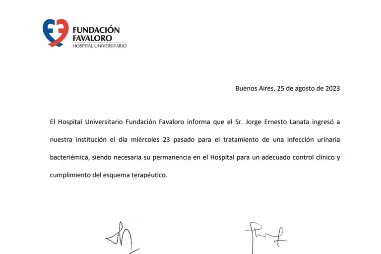 En el primer y único parte médico de la internación del conductor de Radio Mitre y El Trece, se destacó el problema de salud por el que el periodista fue hospitalizado. "El Hospital Universitario Fundación Favaloro informa que el señor Jorge Ernesto Lanata ingresó a nuestra institución el día miércoles 23 pasado para el tratamiento de una infección urinaria bacteriémica, siendo necesaria su permanencia en el hospital para un adecuado control clínico y cumplimiento del esquema terapéutico", precisaron en el comunicado.