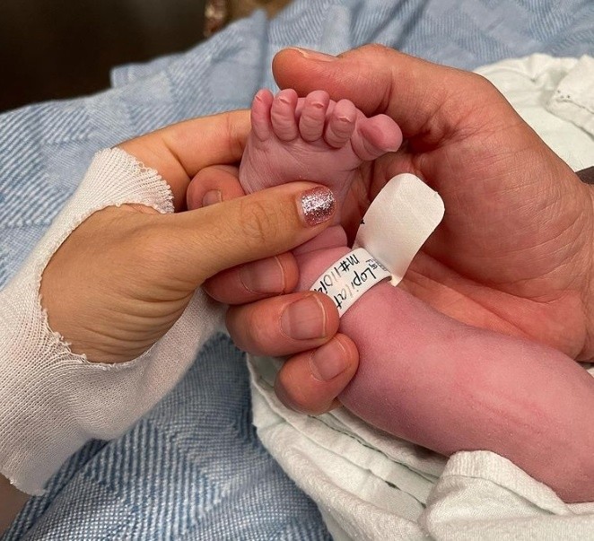 La pareja anunció la buena noticia en redes sociales con la foto de los piecitos de la recién nacida en la que en una cinta está escribo el nombre de la beba.