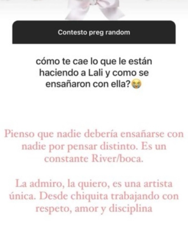 Y hubo respuesta: “Pienso que nadie debería ensañarse con nadie por pensar distinto. Es un constante River-Boca”.