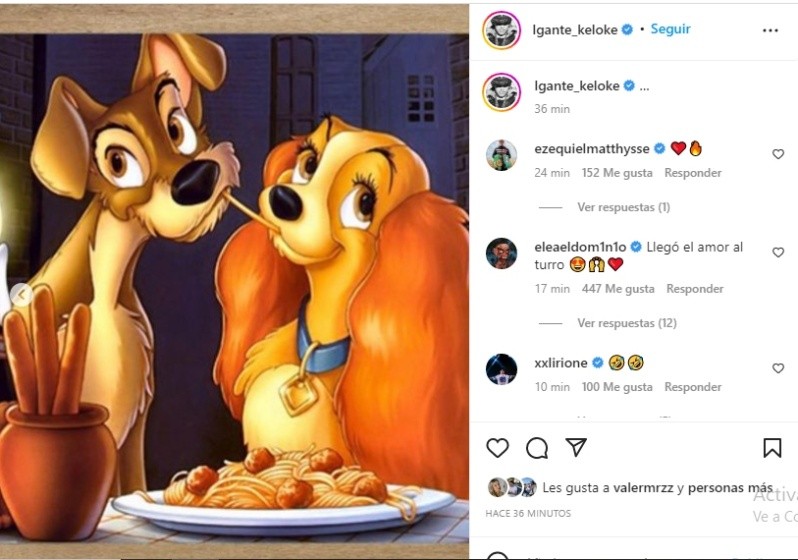 La confirmación llegó este jueves, con la publicación de fotos de L-Gante. En la que, se los ve a los dos de espaldas y de fondo el set de filmación. Asimismo, la acompañó de una imagen de la Dama y el Vagabundo: la historia clásica animada de Walt Disney, sobre un romance entre una perrita mimada y un perro vagabundo.