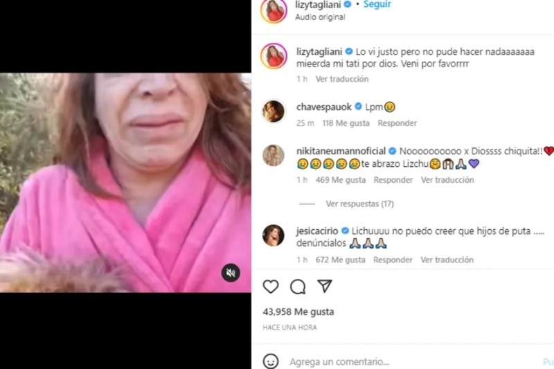 Son días de mucho dolor para Lizy Tagliani, quién días atrás tuvo un accidente con su auto y ahora, a flor de piel, compartió un crudo video después de que su perra, Tati, a quien tenía desde que su madre estaba viva, fue atacada por otro perro y murió.