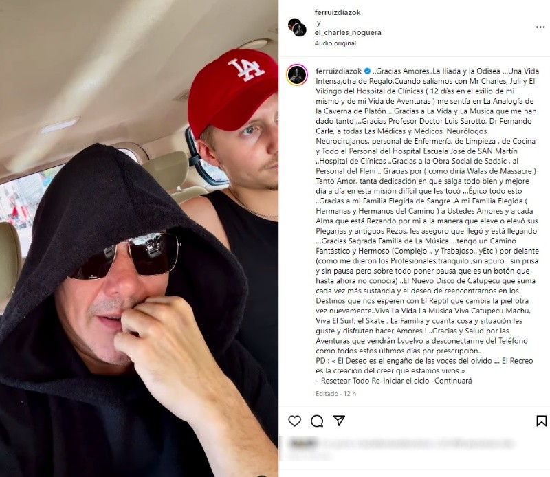 En el mensaje, el artista explicó que "no es una alta médica, tengo que ir recuperando solo el equilibrio" e indicó que el “fue un ACV fuertísimo. Tengo una cosita en el corazón que después la tendré que operar”.