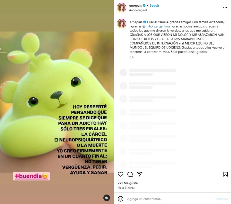 Subió la imagen de un oso de color verde y un mensaje de concientización: "Hoy me desperté pensando que siempre se dice que para un adicto hay solo tres finales: la cárcel, el neuropsiquiátrico o la muerte. Yo creo firmemente en un cuarto final: no tener vergüenza, pedir ayuda y sanar".