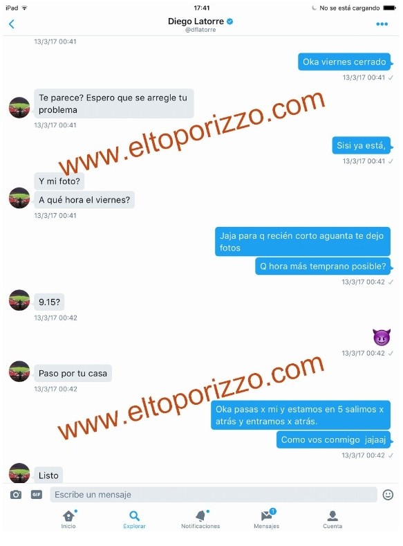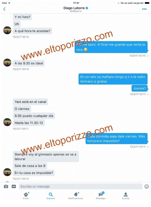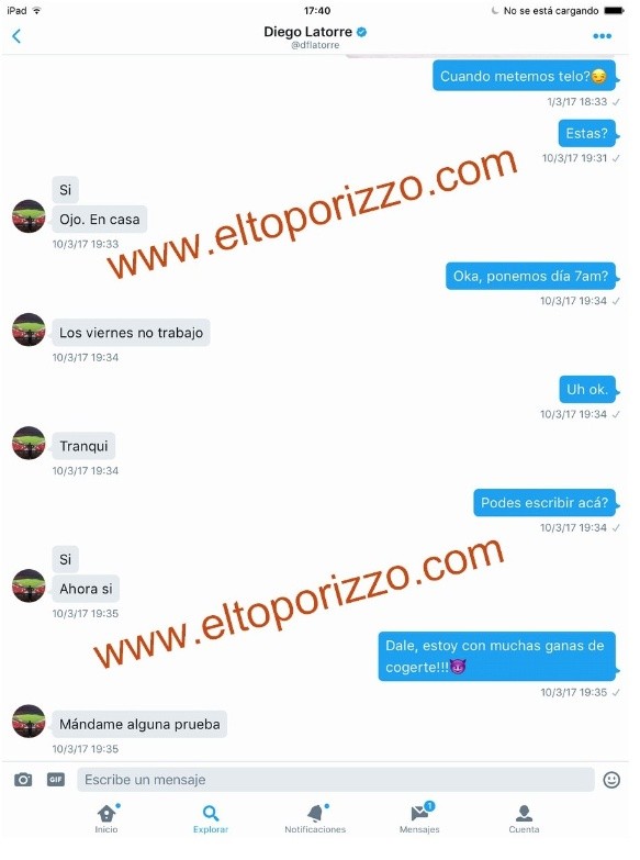 Un video y varias capturas de pantalla de supuestas conversaciones privadas subidas de tono a través de Twitter entre el ex futbolista Diego Latorre y la conductora Natacha Jaitt estallaron en las redes sociales este domingo. El diálogo difundido sería de marzo de este año pero trascendieron recién ahora y aparentemente está vinculado a que la morocha le robaron una tablet. Si bien el ahora comentarista deportivo no habló del tema, desde su entorno dijeron que es todo un montaje y que presentará una demanda en la Justicia contra quien difundió lo que desde su punto de vista es una versión falsa.
