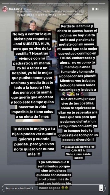 Luego, llegó otra fuerte declaración de Tamara: "No voy a contar lo que hiciste por respeto a Jami, nuestra hija, ¿pero que yo vivo de tu costilla? Nosotras vivimos con mi padrastro y mi mamá. Yo fui a tener a un hospital".