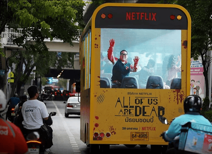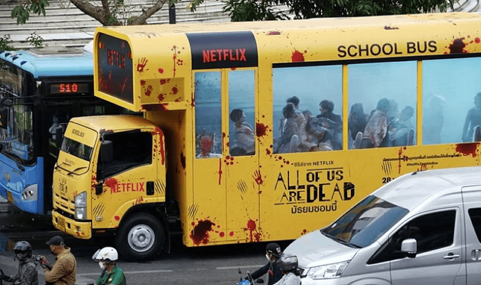 Pero más allá de la serie en sí, lo que también llamó la atención fue una campaña publicitaria que la plataforma llevó a cabo en Tailandia, en donde un colectivo escolar manchado de sangre recorrió las calles de Bangkok.