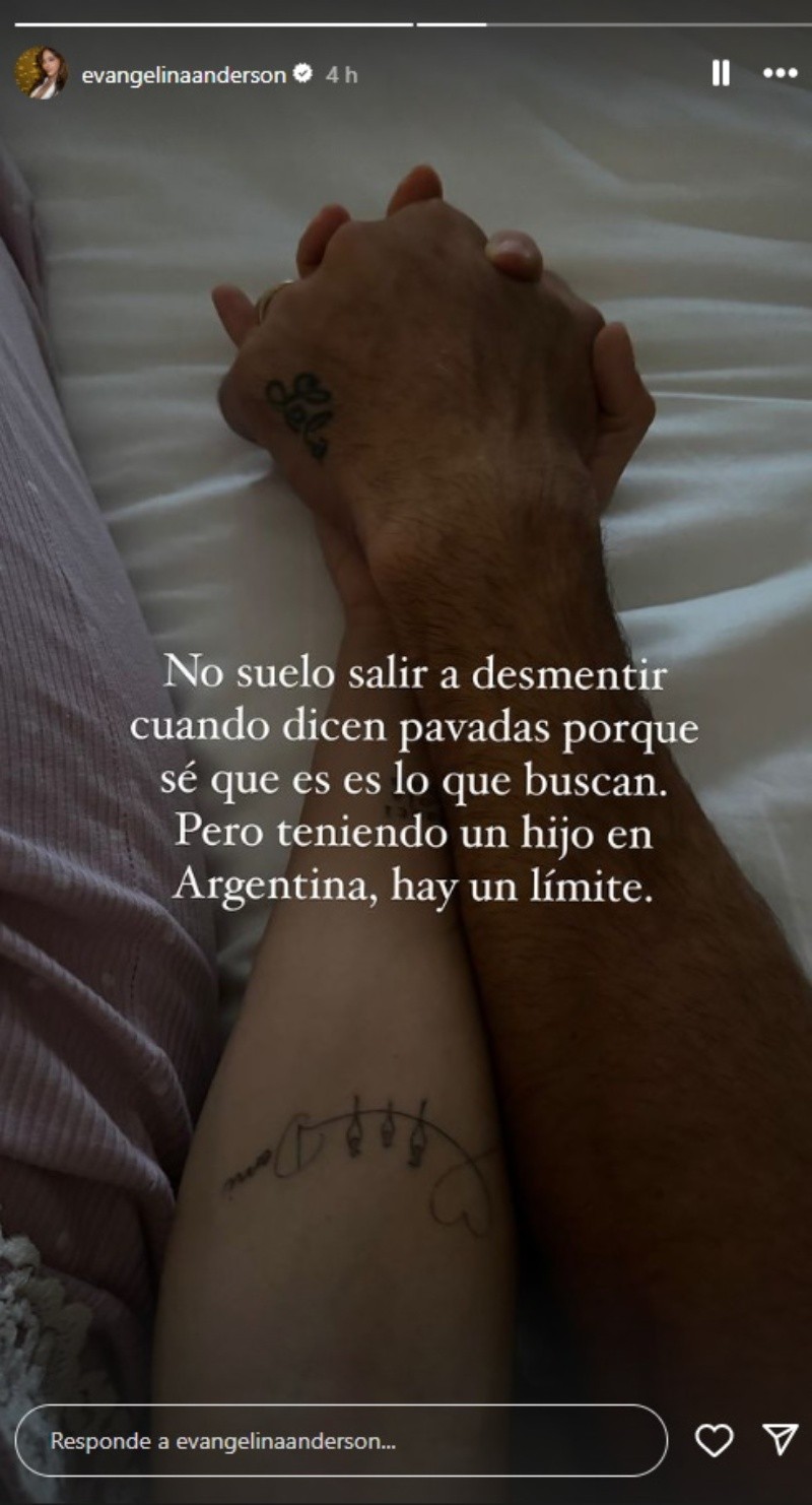 Luego de que el rumor de una ruptura se replicara en los medios, la modelo Evangelina Anderson desmintió la separación de Martín Demichelis. A través de un mensaje en redes sociales, advirtió: “Hay un límite”.