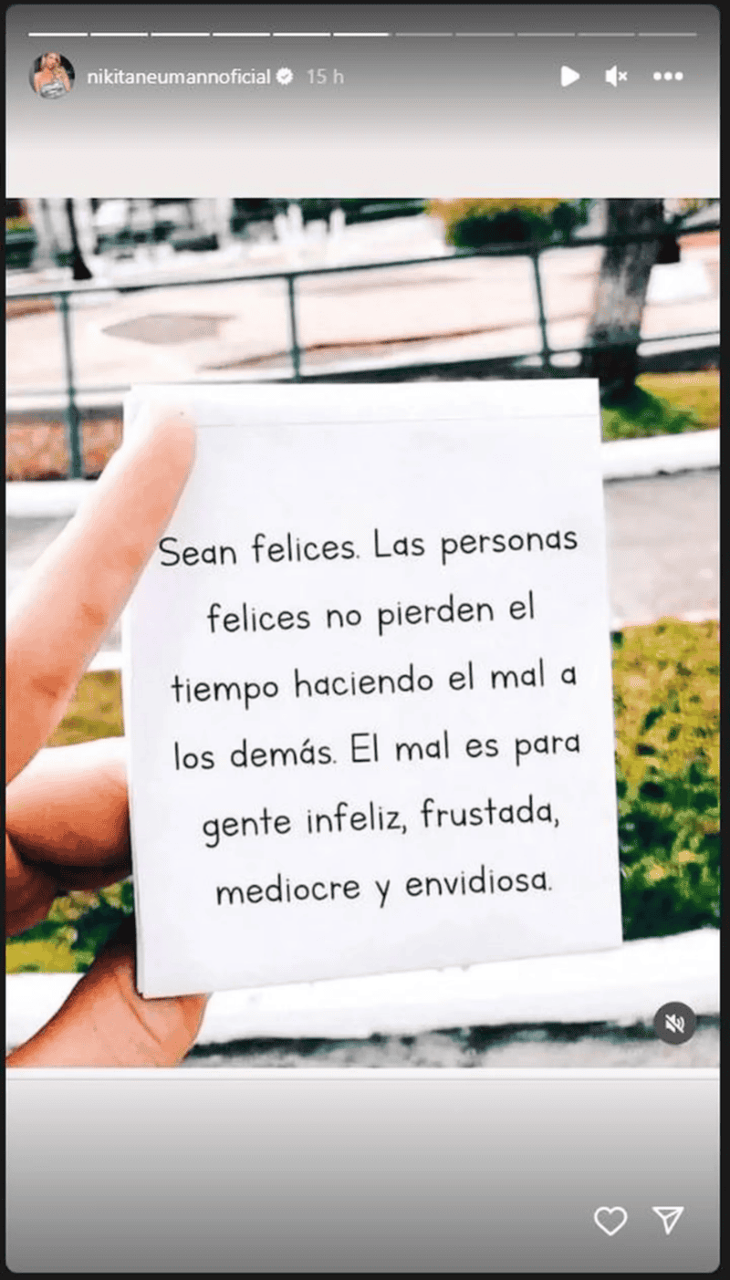 "Sean felices. Las personas felices no pierden el tiempo haciéndole el mal a los demás. El mal es para gente infeliz, frustrada, mediocre y envidiosa", se lee en una de sus historias de Instagram.
