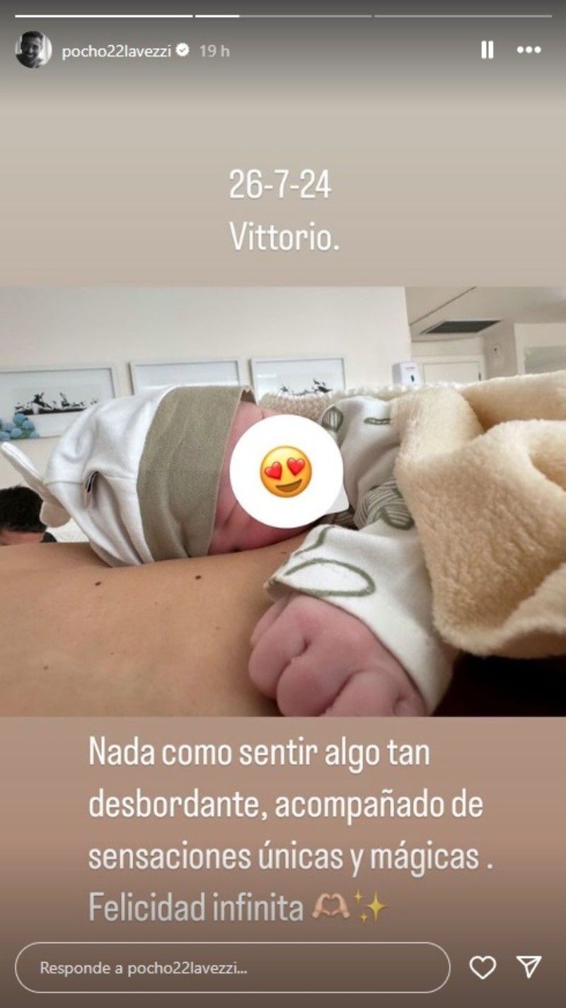 “26-7-24. Vittorio”, se lee en la historia de Instagram que publicó Lavezzi. En el posteo, se puede ver al niño, el nuevo integrante de la familia, en pleno descanso.