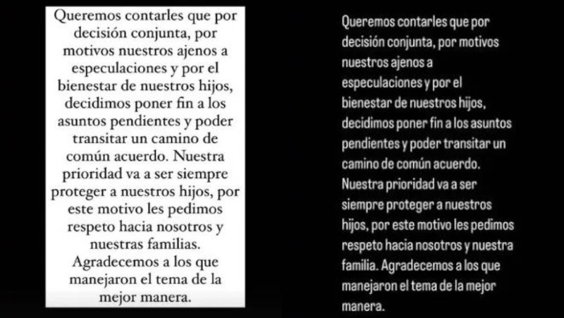 En el texto que redactaron junto a sus letrados, expresaron: “Queremos contarles que por decisión conjunta, por motivos nuestros ajenos a especulaciones y por el bienestar de nuestros hijos, decidimos poner fin a los asuntos pendientes y poder transitar un camino de común acuerdo”.