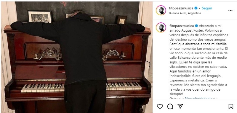 Fito Páez mostró en sus redes sociales que recuperó el viejo piano de la familia, que habitó su casa de Balcarce al 600 durante más de 50 años y en el que el músico comenzó a jugar a serlo. "Abrazado a mi amado August Foster. Volvimos a vernos después de infinitos caprichos del destino como dos viejos amigos. Sentí que abrazaba a toda mi familia en ese momento tan emocionante".