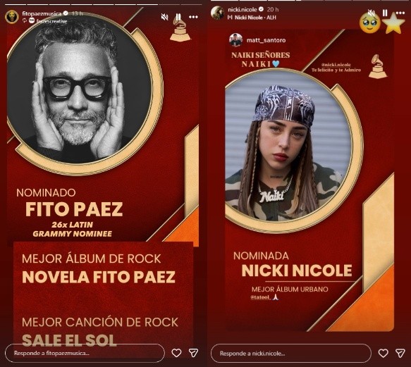 Fito Páez compite en el apartado Mejor Álbum de Rock por su último disco, Novela, y en la categoría Mejor Canción de Rock, con “Sale el Sol”. Por su parte, Nicki Nicole busca un gramófono en el apartado Mejor Álbum de Música Urbana, con Naiki.