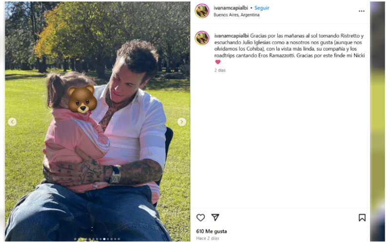 Sin embargo, Ivana Capialbi subió fotos junto a él y su hija en Instagram. "Gracias por las mañanas al sol tomando Ristretto y escuchando Julio Iglesia como a nosotros nos gusta", dijo y agregó: "Con la vista más linda, su compañía y los roadtrips cantando Eros Ramazzotti. Gracias por este finde mi Rick".