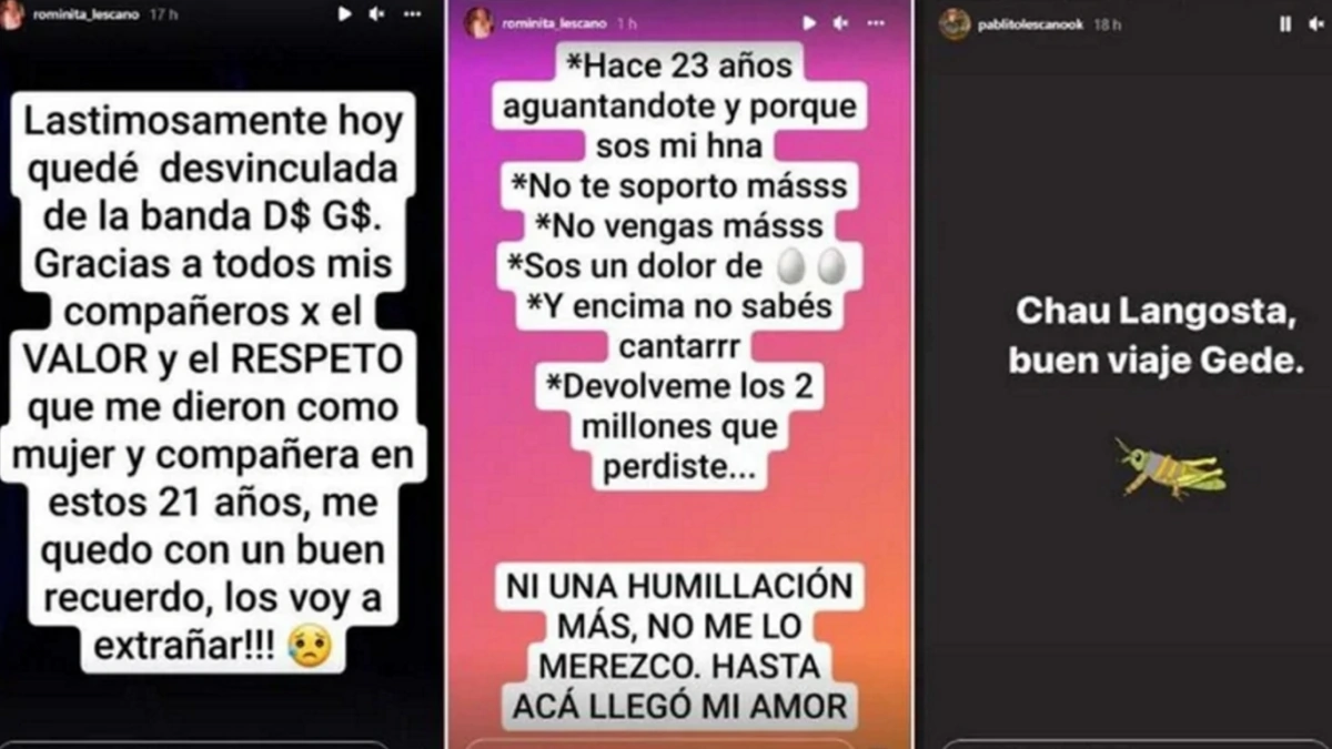 En la segunda publicación, Romina enuméró con astericos frases que el lider de Damas Gratis le habría dicho a ella durante una discusión: “Hace 23 años vengo aguantándote porque sos mi hermana"; "No te soporto más"; "No vengas más"; "Sos un dolor de huevos"; ‘Y encima no sabés cantar"; "Devolvéme los dos millones que perdiste".