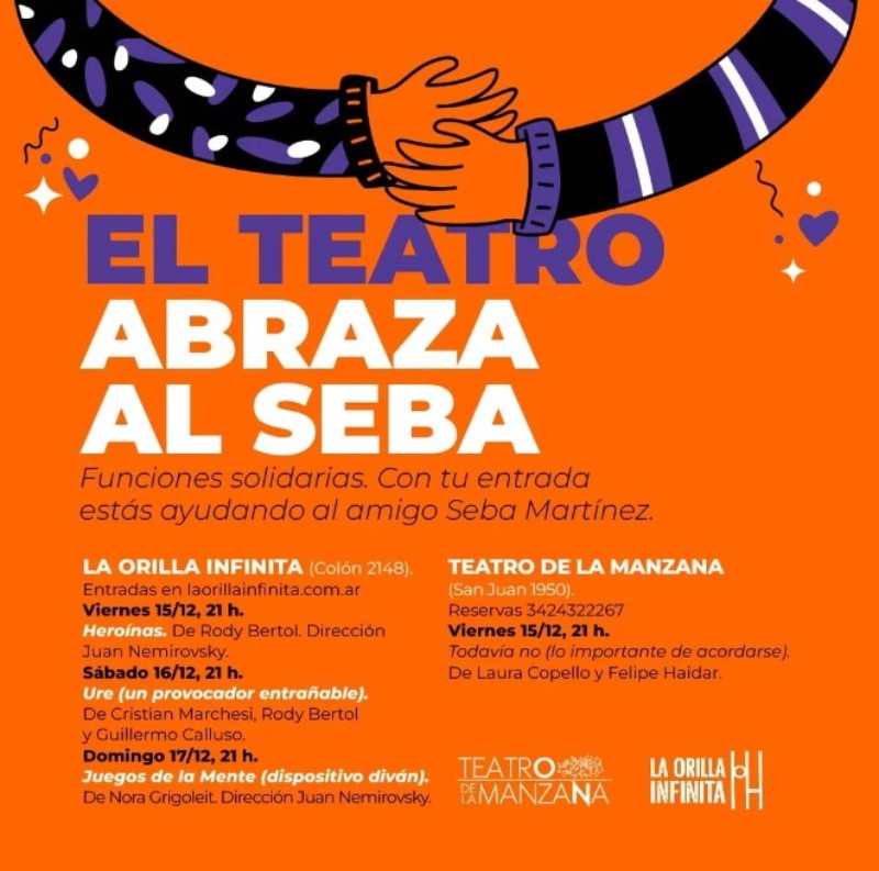 Trabajadoras y trabajadores del teatro rosarino lanzaron la campaña solidaria El teatro abraza al Seba, en apoyo al actor Sebastián Martínez. Se trata de una serie de funciones a beneficio del artista cuyas entradas tienen un valor de 2000 pesos. Las mismas se desarrollarán el próximo fin de semana en las salas Teatro de La Manzana y La Orilla Infinita.