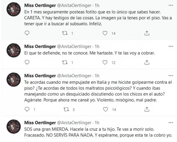 "¿Te acordás cuando me empujaste en Italia y me hiciste golpearme contra el piso? ¿Te acordás de todos los maltratos psicológicos? ¿Y cuando ibas manejando como un desquiciado discutiendo con los chicos en el auto? Agárrate. Porque ahora me cansé yo. Violento, misógino, mal padre", continuó Oertlinger.