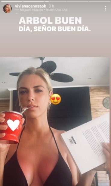 Viviana publicó la foto entre sus historias de Instagram con la canción “Buen día, día” (Miguel Abuelo) de fondo. En una mano, la conductora de América 24 tiene un mate y en la otra, un libro.