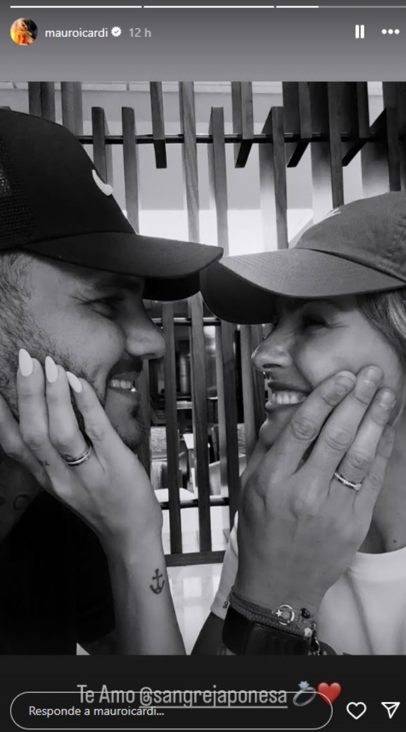 Icardi fue quien compartió una foto en la que ambos se miran de frente y cada uno le toma con las manos la cara al otro. Los dos llevan puestas alianzas en sus dedos anulares. “Te amo”, escribió Icardi junto a un emoji de un anillo y un corazón rojo, confirmando su decisión.