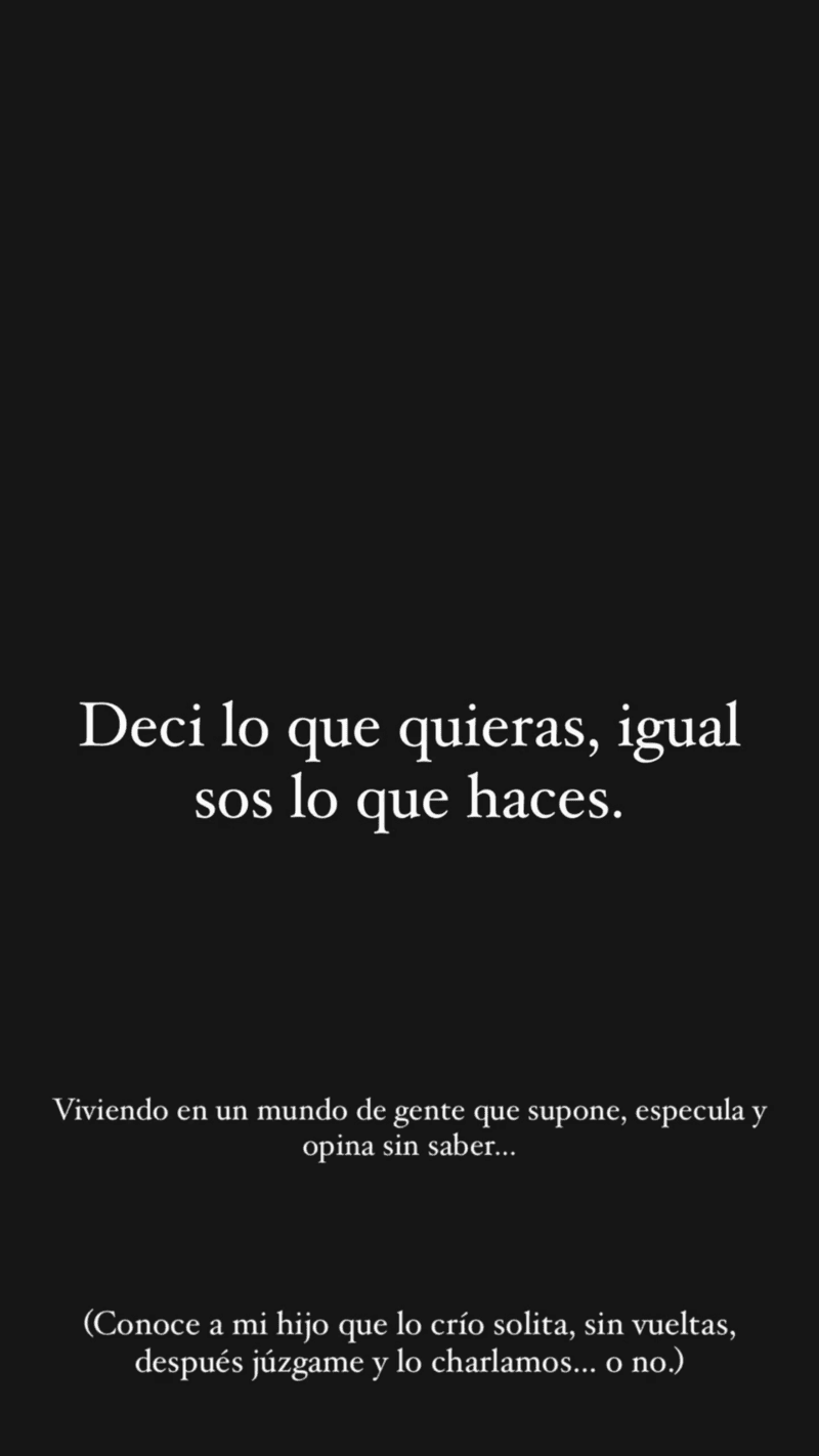 En la misma línea, remató: "Viviendo en un mundo de gente que supone, especula y opina sin saber. Conocé a mi hijo que lo crío sin vueltas, después juzgame y lo charlamos, o no".