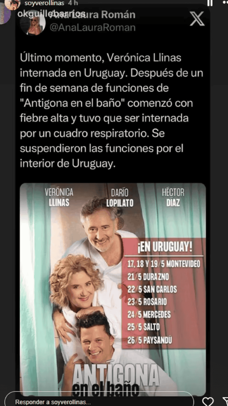 "Empezó con fiebre ya el domingo. En este momento se encuentra internada en Montevideo sin poder hacer las funciones, porque tenían seis más previstas de acá al fin de semana que viene, todo el interior de Uruguay", comentó Ana Laura Román en el programa "El impertinente" (Net TV).