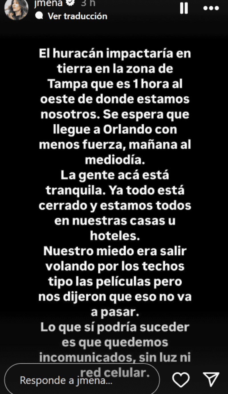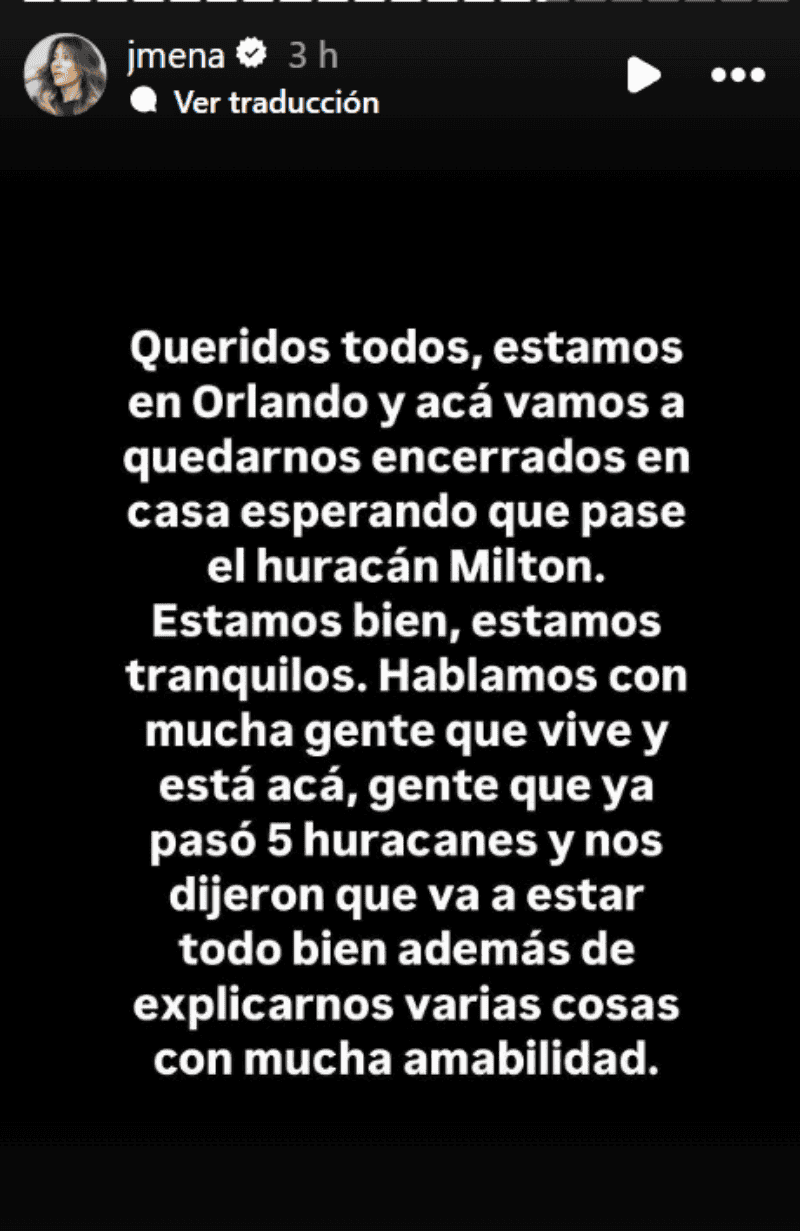 Recientemente, Jimena hice una nueva publicación. "Queridos todos, estamos en Orlando y acá vamos a quedarnos encerrados en casa esperando que pase el huracán Miltón", indicó y aseguró que están "bien y tranquilos" porque vecinos del lugar le explicaron cómo pasar el momento.