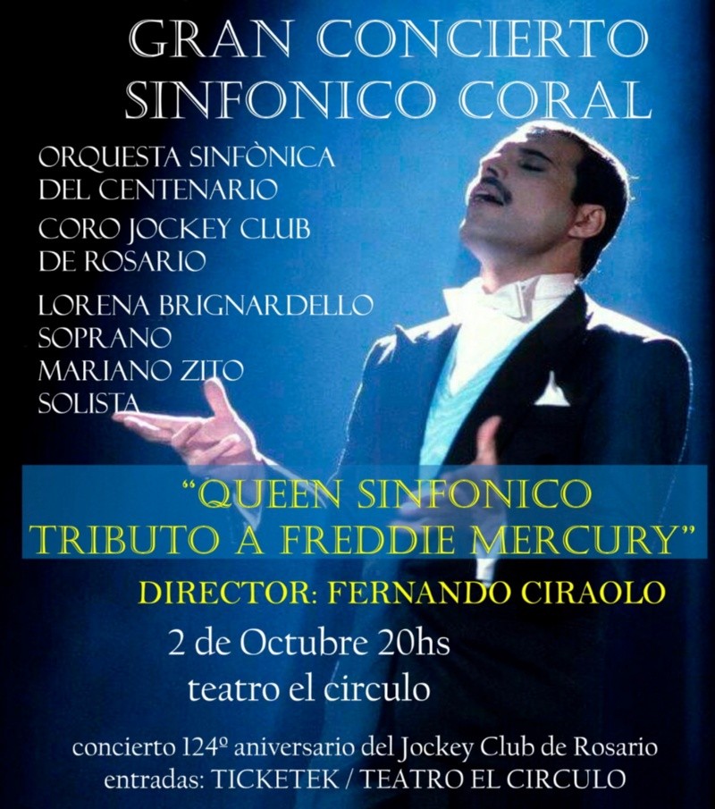 En el marco del 124º aniversario del Jockey Club de Rosario se realizará un concierto sinfónico coral "Queen Sínfónico, tributo a Freddie Mercury" en el teatro El Círculo.