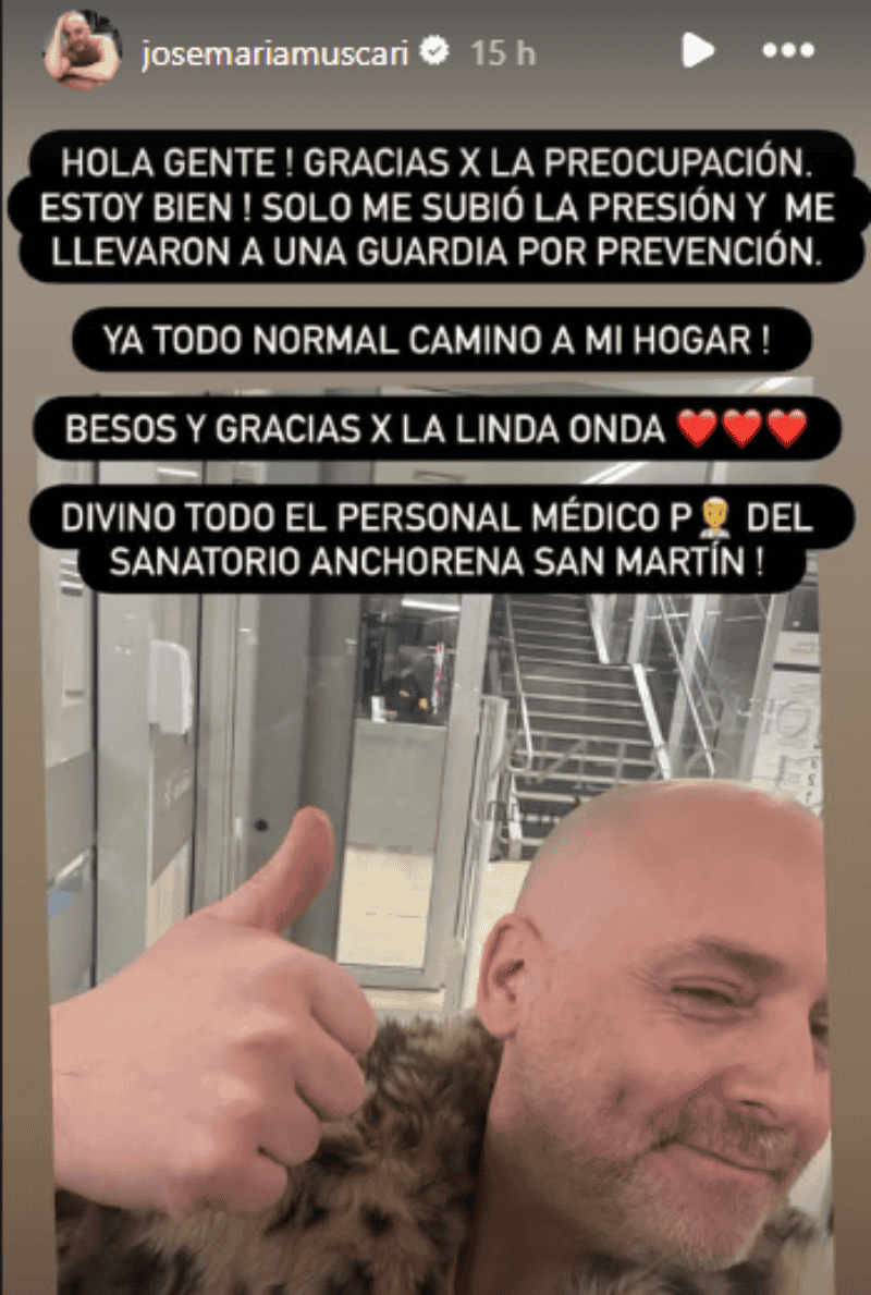 Luego de ser atendido por profesionales de la salud, Muscari subió una selfie saliendo de la clínica para mostrar que ya se encontraba bien. Recientemente, en otra historia de Instagram explicó lo que pasó: "Estaba listo para jugar y me empezó a salir sangre de la nariz. Me midieron la presión y estaba alta".