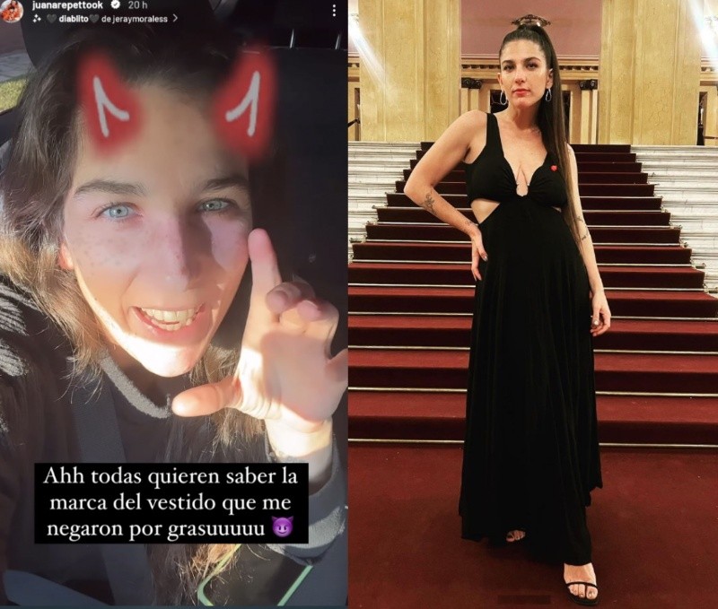 "Obvio, soy low level, no me lo quisieron dar”, señaló Juana quien en otro posteo, en una foto en la que de dibujó cuernos, escribió: “Todas quieren saber la marca del vestido que me negaron por grasu".