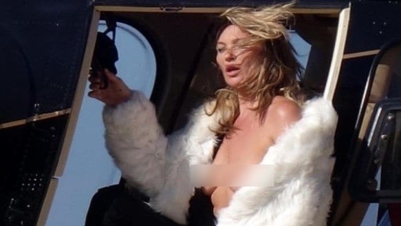 En las imágenes se la puede ver a la modelo en un helicóptero que sobrevuela la isla de Capri, en Italia con una ajustado pantalón negro, botas altas con flecos y un abrigo de piel color natural, que entreabierto deja sus pechos al descubierto. Mientras que el viento revuelve su rubia cabellera.