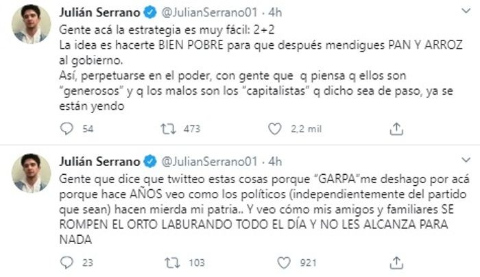 Enojado por las nuevas medidas, Serrano se expresó en contra del Gobierno y fue duramente criticado. Según lo informado, la compra de dólar ahorro tendrá a partir de este miércoles un recargo del 35% en concepto de retención del impuesto a las Ganancias y las operaciones con tarjetas de crédito que se realicen en el exterior también serán computadas dentro del cupo de los 200 dólares mensuales.