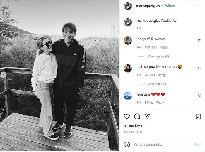 "Paulilo", escribió en su cuenta de Instagram Martina, junto con el emoji de un corazón y con tres imágenes de ella y del trapero en el que se ven las sierras cordobesas de fondo. "Junticos", escribió él al compartir la misma publicación.