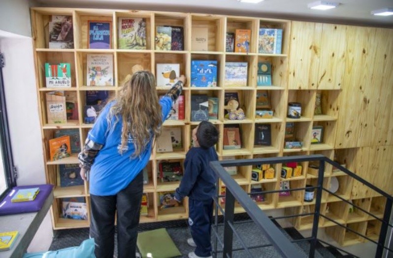 Las reformas en el salón principal contemplaron un dispositivo de biblioteca abierta. Este espacio de lecturas y juegos cuenta con una amplia variedad de libros para niñas y niños, rompecabezas y juegos de mesa. También se llevó a cabo un espacio dedicado a la primera infancia con juegos de arrastre, libros y dispositivos lúdicos.
