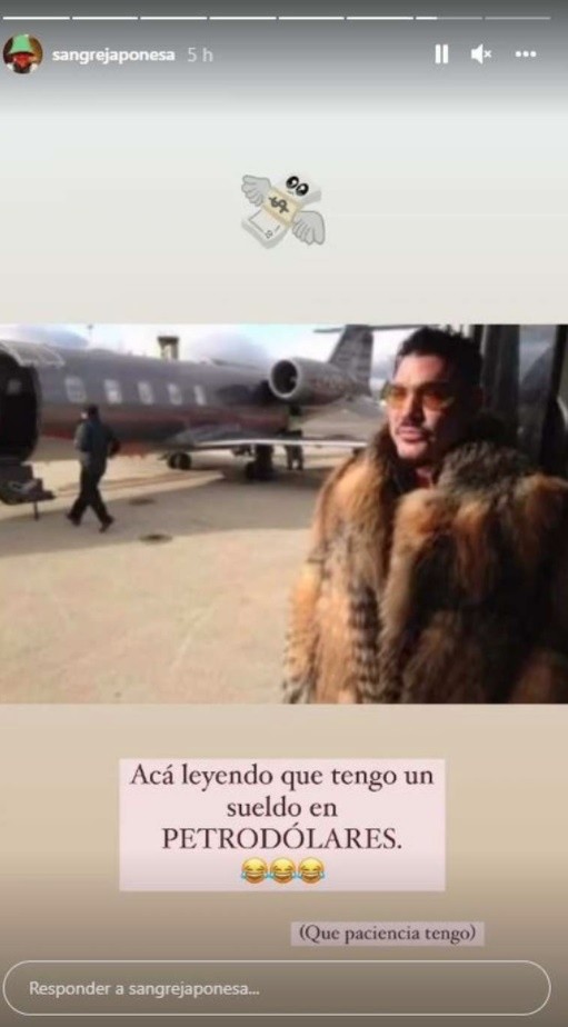 “Acá, leyendo que tengo un sueldo en petrodólares. Qué paciencia que tengo”, escribió Suárez en una historia en la que se ve una imagen de Ricardo Fort, con un tapado de piel y un avión privado de fondo.