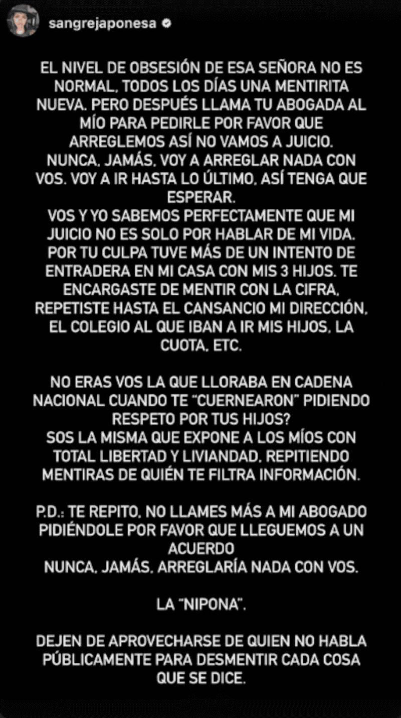 "Después llama tu abogada al mío para pedirle por favor que arreglemos así no vamos a juicio. Jamás voy a arreglar nada con vos, voy a ir hasta lo último así tenga que esperar. Vos y yo sabemos perfectamente que mi juicio no es solo por hablar de mi vida", siguió "la china".