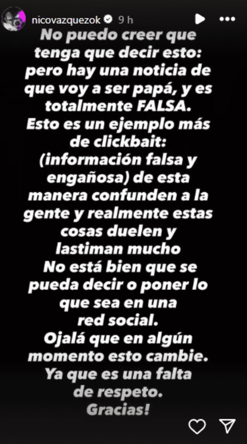 “No puedo creer que tenga que decir esto: pero hay una noticia de que voy a ser papá, y es totalmente FALSA“, escribió en su cuenta de X. “Esto es un ejemplo más de clickbait: (información falsa y engañosa) de esta manera confunden a la gente y realmente estas cosas duelen y lastiman mucho", agregó.