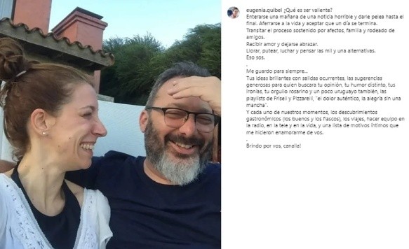 Minutos después de que se conoció la triste noticia de la muerte del conductor, Quibel escribió una reflexión en redes sociales, y lo hizo junto a una foto de la pareja, sonrientes. “¿Qué es ser valiente? Enterarse una mañana de una noticia horrible y darle pelea hasta el final. Aferrarse a la vida y aceptar que un día se termina. Transitar el proceso sostenido por afectos, familia y rodeado de amigos. Recibir amor y dejarse abrazar. Llorar, putear, luchar y pensar las mil y una alternativas. Eso sos”, comenzó la locutora.