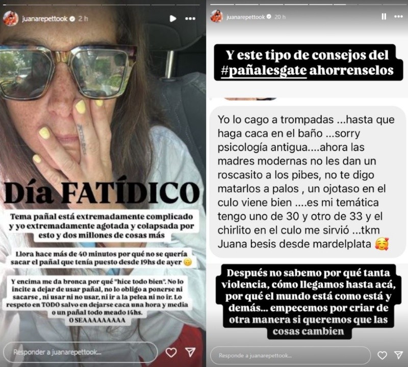 “Día fatídico”, escribió Juana en la primera de las publicaciones referidas a la negativa de su hijo de tres años de acceder a un cambio de pañal. “Tema pañal está extremadamente complicado y yo extremadamente agotada y colapsada por esto y dos millones de cosas más. Llora hace más de 40 minutos porque no quería sacarse el pañal que tenía puesto desde las 19 de ayer”, relató la actriz.