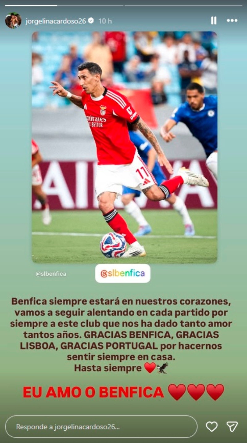 A poco de la incorporación de Ángel Di María a Rosario Central y tras la salida del Benfica del Mundial de Clubes, Jorgelina Cardoso, la esposa de Fideo, manifestó su agradecimiento al club portugués con una historia en Intagram.