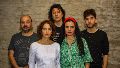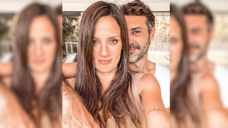 En la imagen, Paula y Pedro están acostados boca abajo en una pileta de niños y sus tres hijos, encima de la pareja; todos mirando a la cámara.