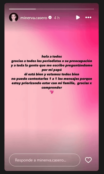 La actriz llevó tranquilidad a los seguidores de Alfredo y mediante una historia de Instagram habló sobre cómo evoluciona su padre: "Gracias a todos los periodistas por su preocupación y a toda la gente que me escribe preguntándome por mi papá", empezó.
