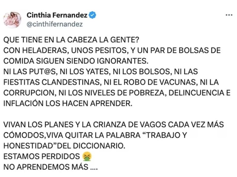"¿Qué tiene en la cabeza la gente? Con heladeras, unos pesitos y un par de bolsas de comida siguen siendo ignorantes", lanzó en la red social.