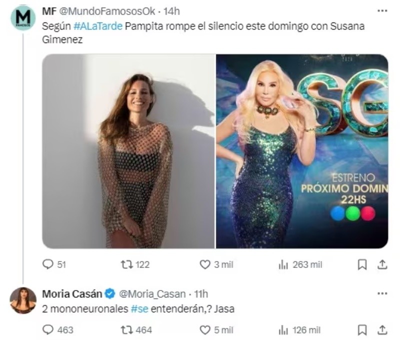 La cuenta de X @mundofamososok aseguró que Ardohain estará este domingo con Giménez para hablar de su crisis matrimonial con García Moritán y, entre las reacciones a la noticia, el comentario de Moria no pasó inadvertido.