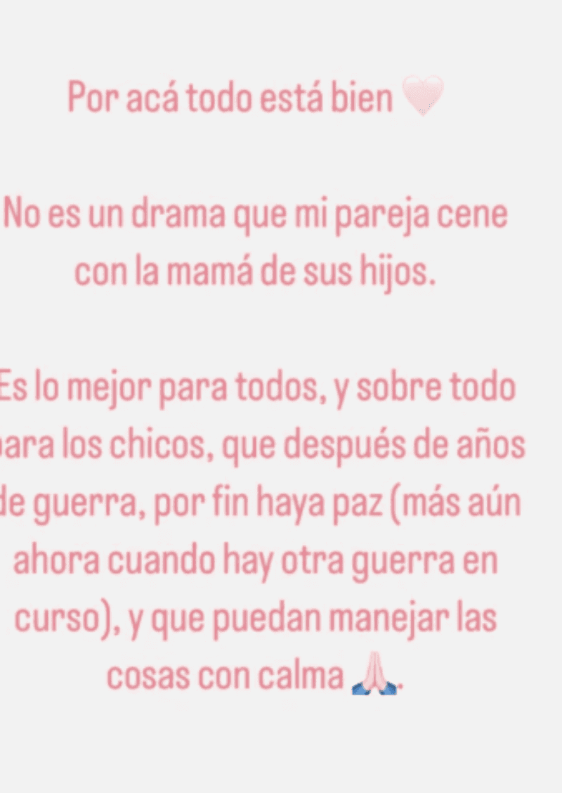 “Por acá todo está bien", arrancó el mensaje y agregó: "No es un drama que mi pareja cene con la mamá de sus hijos. Es lo mejor para todos, y sobre todo para los chicos, que después de tantos años de guerra haya paz, y que puedan manejar las cosas con calma”.