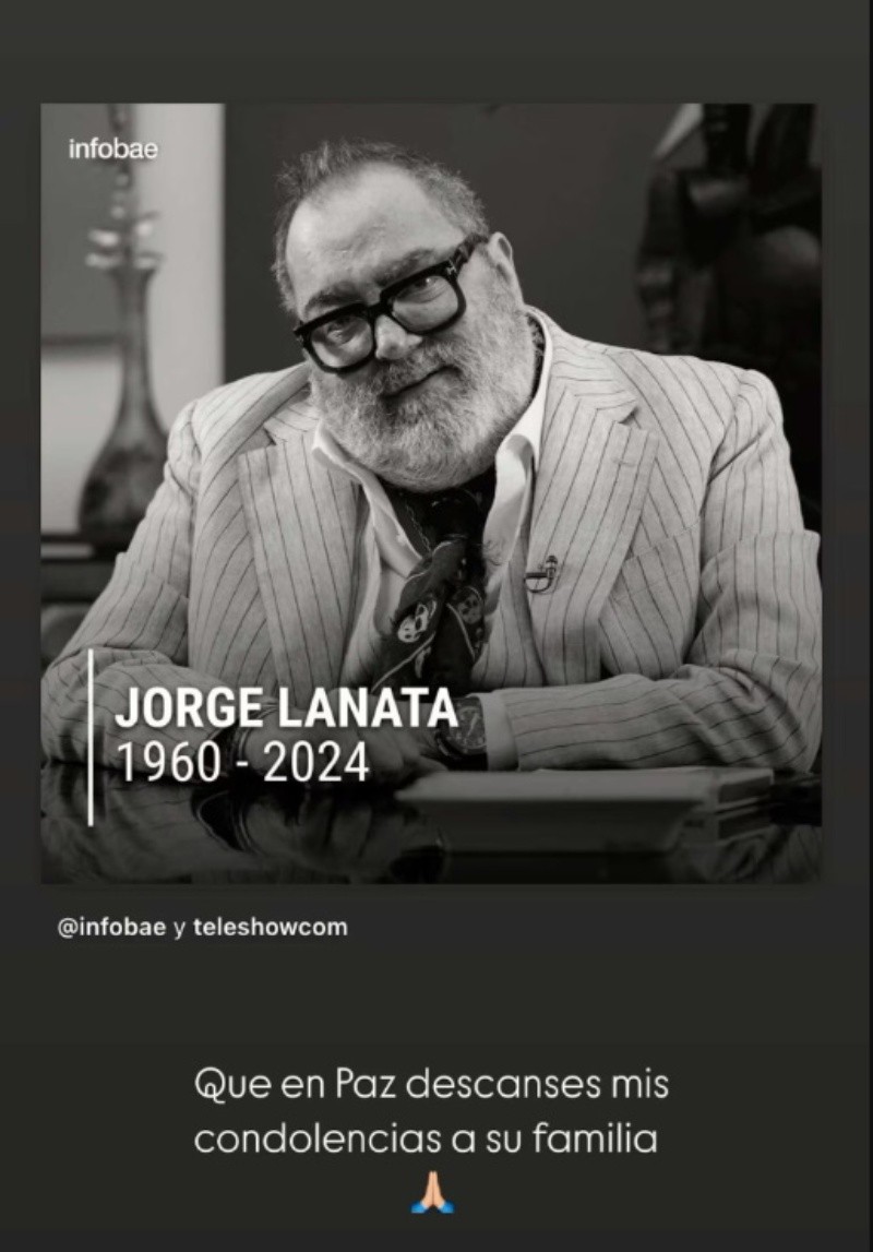 En una imagen den blanco y negro de Lanata, se lee la frase: “Que en paz descanses. Mis condolencias a su familia”. El texto está acompañado de un emoji con dos palmas unidas, en señal de rezo.