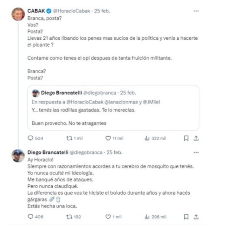 "Branca, ¿posta? ¿Vos? Llevas 21 años libando los penes más sucios de la política, ¿y venís a hacerte el picante? Contame cómo tenés el opi después de tanta fruición militante", lo cruzó Horacio.